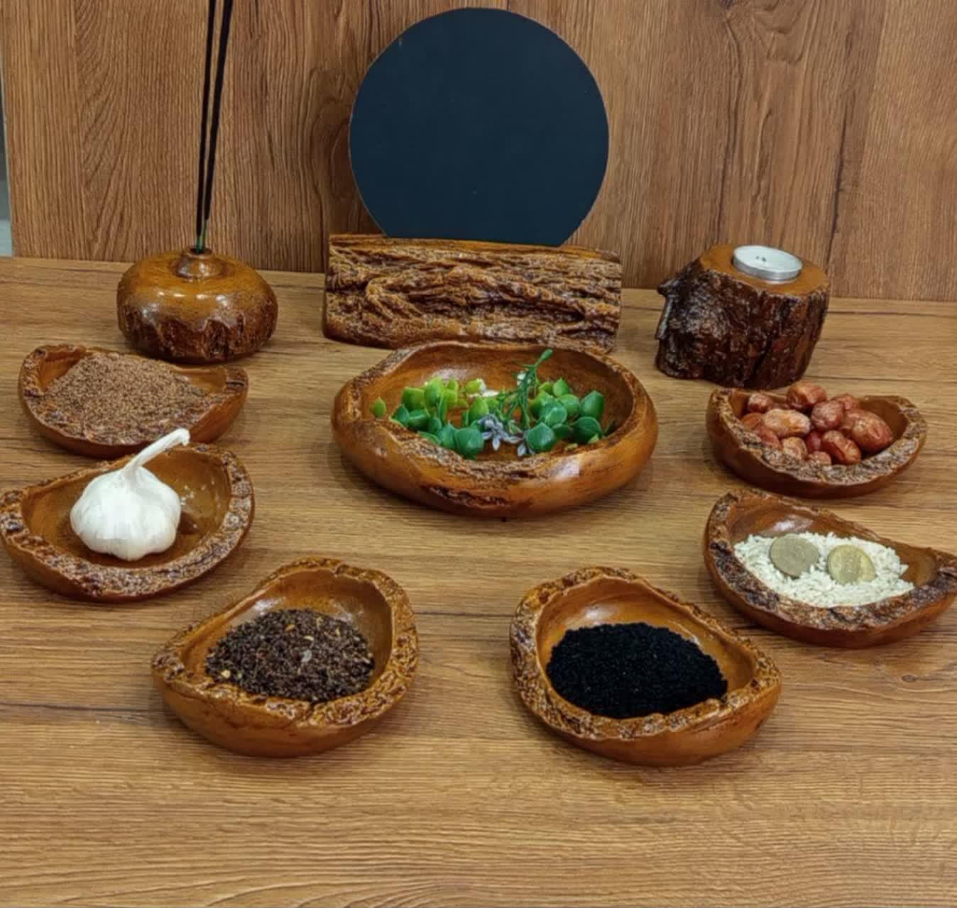 تعداد۶ کاسه کوچک ،یک کاسه بزرگ ،استند آینه، گلدان ،جاوارمری
